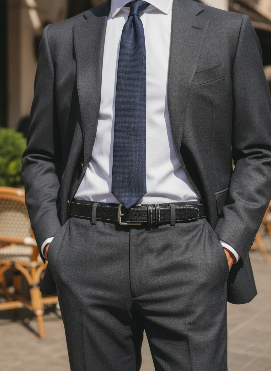 Avec ses cinq trous d'ajustement, cette ceinture s'adapte parfaitement à votre taille, que vous la portiez sur les hanches ou à la taille. Son design intemporel et ses surpiqûres blanc cassé en font un accessoire versatile, idéal pour toutes les occasions, que vous soyez un Homme ou une Femme.