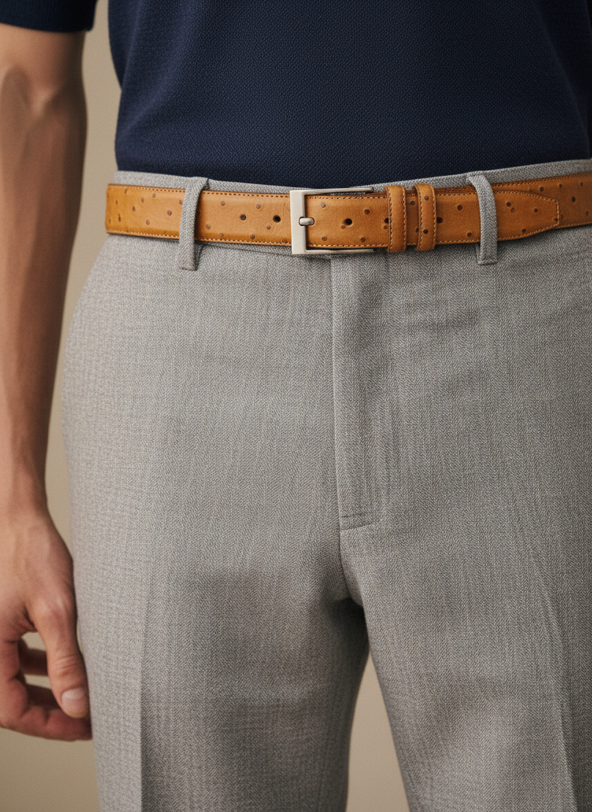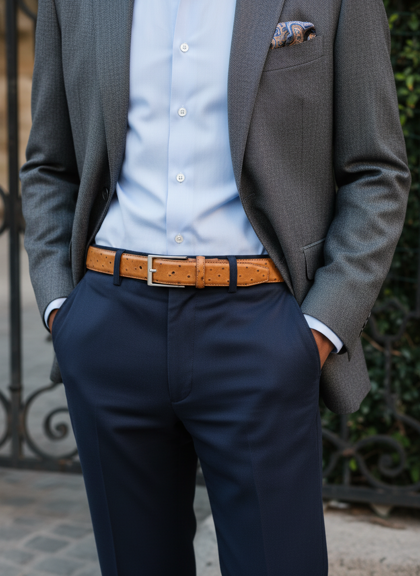Ceinture en cuir embossé imitation autruche, fabriquée à la main en Italie. Elle offre un style original mais discret, adapté aux tenues habillées comme plus décontractées. La largeur standard de 35 mm permet de la porter facilement avec la plupart des pantalons. Le cuir est patiné pour donner des nuances subtiles au marron clair, sans effet brillant excessif.