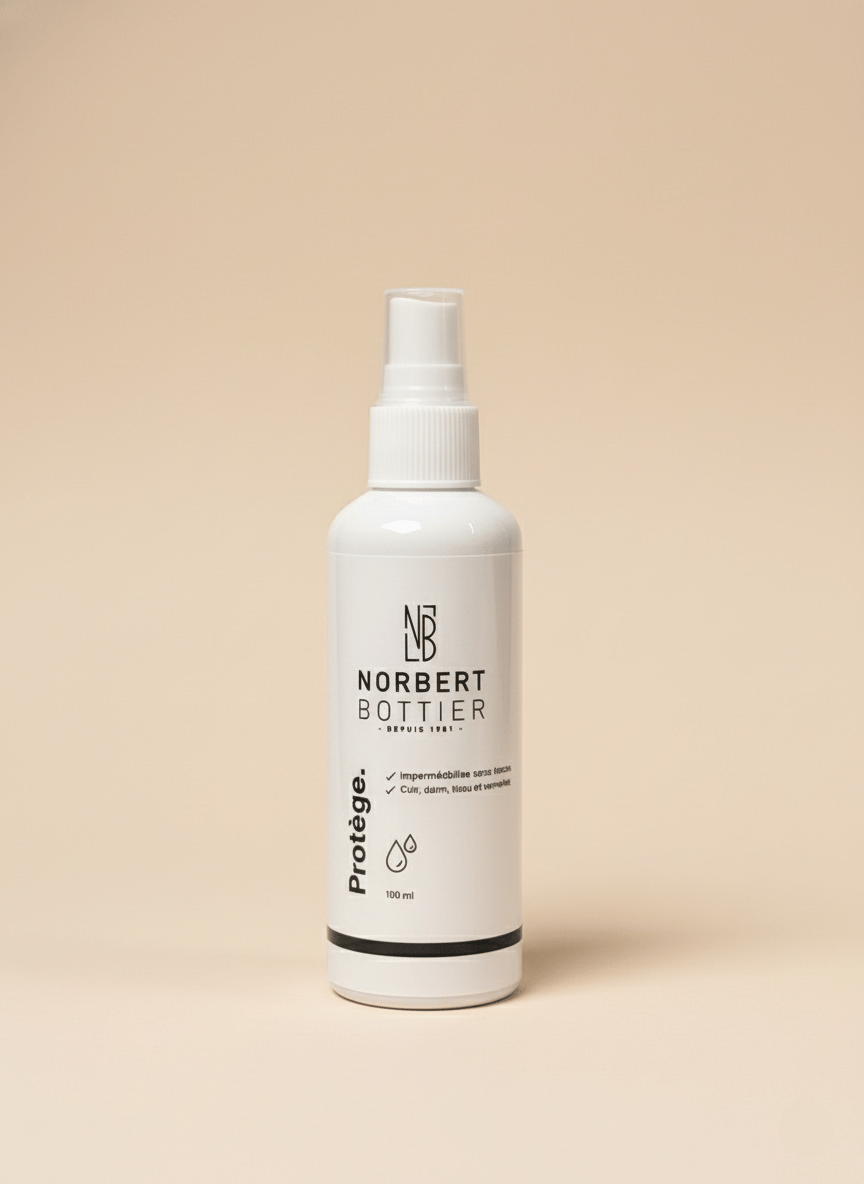 - Spray imperméabilisant 100 ml — Protège durablement contre l’eau et les taches. Compatible avec les cuirs, daims, nubucks, tissus et toiles. Laisse une barrière invisible qui n’altère ni la couleur ni la texture.